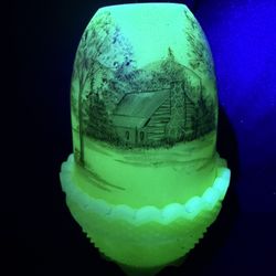 Fenton “Cabin in the Woods” Uranium Custard Glass Fairy Lamp$150Berwick, PA