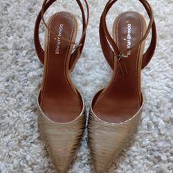 Donald Piner Gold Striped Kitten Heel With A Suede Ankle Strap And Leather Sole.$20South Heidelberg Township, PA