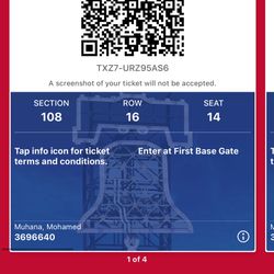 4 Tickets To The Phillies Game On April 1st, Section 108 Vs The Nationals$200Philadelphia, PA
