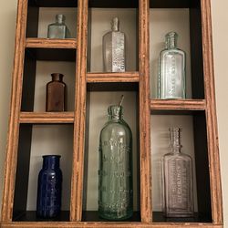 7 Antique Pharmacy Bottles With Wood Shelf$10Lafayette Hill, PA