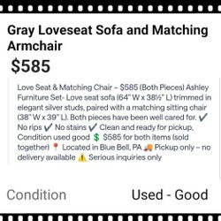 Gray Loveseat Sofa and Matching Armchair $585Penllyn, PA