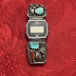 Apachito Navajo Sterling Silver Turquoise & Coral Watch Cuff Bracelet-Timex$450Levittown, PA