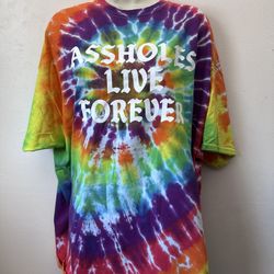 Vibrant tie-dye t-shirt with bold graphic text. Features a mix of purple, orange, green, and yellow colors. Assholes Live Forever ALF Rainbow Tie Dye$25Ashland, MA