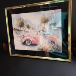 Vintage 8 By 12 Artwork Women With 1939 Pink Caddy In France Gold Outlined $19North Smithfield, RI