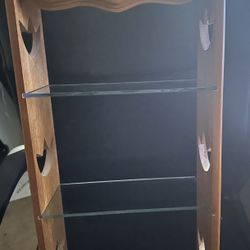 Wooden wall-mounted curio display shelf with tulip cutouts and glass shelves. Common 1980s-1990s home decor.$35Gaston, SC