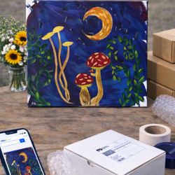 Original Acrylic Painting of Mushrooms and Moon on Canvas $55Elgin, SC