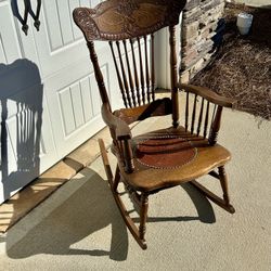 Antique Oak Press Back Rocking Chair with Carved Detail Cobbler Leather Hobnail Seat (leg repair)$65Simpsonville, SC