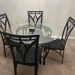 Glass dining table with 4 chairsStylish round glass dining table. Has a cool frosted edge and sturdy metal base. Comes with 4 white chairs. $120Piedmont, SC