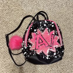 Black and pink sequin backpack with 'A!' design and pink pom pom. Justice Flip Sequin Initial A Mini Backpack Purse Teens Tweens Purple Black Pom$10Charlotte, NC