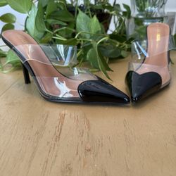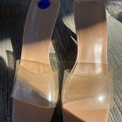 Pretty Little Thing Transparent clear Tan Heels 7 pumps open toe open back plt