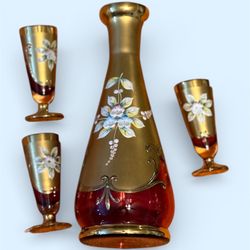 Gold And Floral Red Glass Decanter w/ 3 Glasses$38Pickens, SC