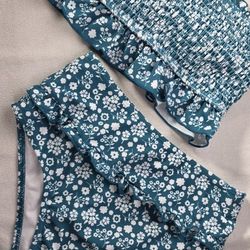 Dark Green Floral Two-piece Women's Bikini Featuring A Smocked Design With Ruffle Trim and High-waisted Bottoms - Size Small$28Simpsonville, SC