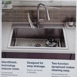 Complete KOHLER Cursiva All-in-One Sink Kit. Has an 18-gauge stainless steel kitchen sink, 33" L x 22" W x$250Greenville, SC