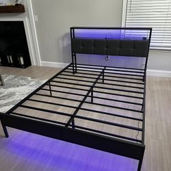 Queen Bed Frame with LED Lights Grey Upholstered Headboard with Charging Station, Type C& 2-Tier Storage Shelves,Metal Platform Bed with 12" Under-Bed$90Inman, SC