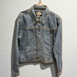 Vtg Harley Davidson Denim Trucker Jacket Metal Studs Embroidered Snap Button Lrg