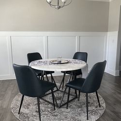 Round marble top dining table with 4 navy blue faux leather chairs$350Collegedale, TN