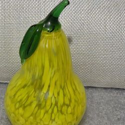 Vintage Hand Blown Art Glass Pear – Yellow Spatter Frit Design – Green Stem & Leaf Paperweight$25Milan, TN