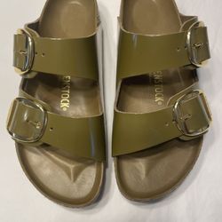 This is a Birkenstock Arizona Big Buckle sandal in high-shine mud green patent leather$80Dandridge, TN