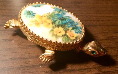 Vintage Signed JEANNE Green Eyed Painted Turtle Tortoise Brooch Gold Tone Pin$50Memphis, TN