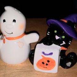 🐈⬛Black Cat And 👻Ghost 🎃 Halloween 🎃 Ceramic Salt And Pepper Shakers New$12Nashville, TN