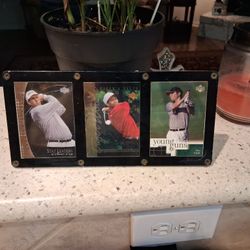 Framed 2001 Upper Deck golf trading cards featuring Stewart Cink, Tiger Woods, and Tim Clark$10Grand Prairie, TX