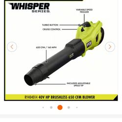 Ryobi 40V Brushless 125 MPH 550 CFM Whisper Jet Blower Only$70Grand Prairie, TX