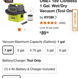 Ryobi One+ 18V Corldless 1 Gal Wet/Dry Vac$80Dallas, TX