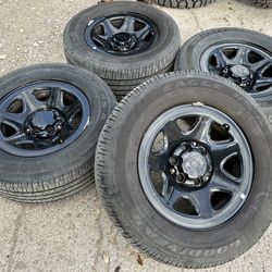 17” black Chevy wheels and Goodyear tires 17 Chevrolet Police Rims 6 lug fit Silverado Tahoe GMC Sierra Yukon factory original stock take Off pull off$550Dallas, TX