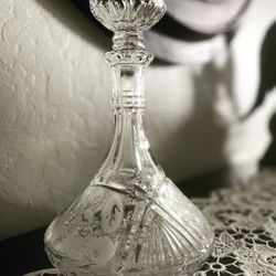 Moms Vintage ~1930s crystal ship's Captain decanter with Frosted etched fruits & flower shaped stopper Hand Etched Crystal Fat Bottom Liquor Decanter $195Austin, TX