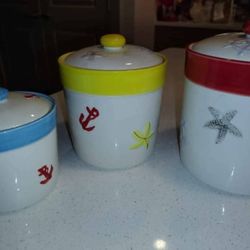 Vintage Set Of 3 Nautical Boating Hand Painted Ceramic Canisters Beach Starfish$50Taylor, TX