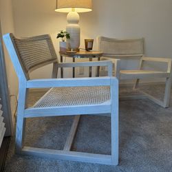 Pair of CB2 Makan white wood armchairs with caned seat and back $400Austin, TX