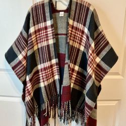 Open Front Plaid Fringed Poncho Cape Wrap Ruana Burgundy Black Beige One Size$10Leander, TX