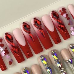Extra long square red press on nails rhinestones,ombré, French tips, hearts$40Vidor, TX