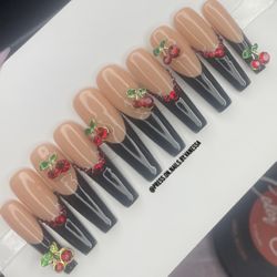 XL coffin nude Press on nails red rhinestones, black French tip, cherries shiny$58Vidor, TX