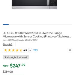 LG Microwave Oven 1.8-cu ft 1000-Watt 29.88-in Over-the-Range with Sensor Cooking (Printproof Stainless Steel) Item #1063846 | Model #MVEM1825F$225College Station, TX