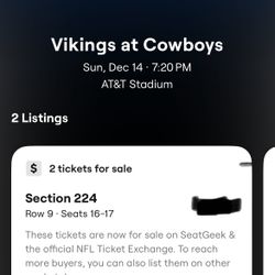 Dallas Cowboys 2 tickets 12/14/25 against Vikings @ 7:30 pm Section 244 / Seat 9/10 $380 for both$350Grand Prairie, TX