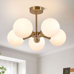 Bektas 5-Lights Semi Flush Mount Ceiling Light Fixture Brushed Gold Light Fixture Straight Bar Modeling With Milk Glass Globe For Bedroom,Living Room,$65Denton, TX