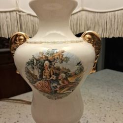 Vintage porcelain lamp with pastoral scene and fringed floral shade$28Grand Prairie, TX