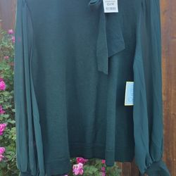 NWT_CeCe Women's Bow Neck Mixed Media Sheer Long Sleeve Sweater Alpine Green.$10Richardson, TX