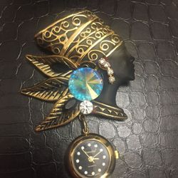 Bonetto watch Nefertiti Egyptian Queen Large AB Rivoli Rhinestone Antiqued Gold tone Metal black face Dangle brooch watch$90Tomball, TX