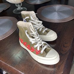 Olive green Converse high tops with red heart design. Comme des Garcons men’s 3 women’s 5 $50$50Houston, TX