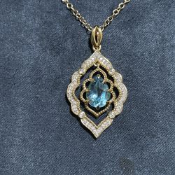 Enchanted Disney Aladdin Pear-Shaped Swiss Blue Topaz and 1/15 CT. T.W. Diamond Arabesque Frame Pendant in 10K Gold$375Porter, TX