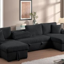 Black Fluffy Sectional Couch With Pull Out Bed And Storage Chaise Delivery Available 🚚$1,250Cypress, TX