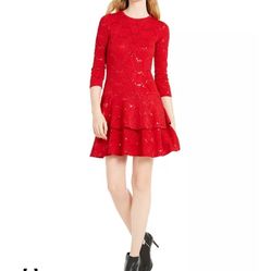 Michael Kors Sequin Jacquard 3/4 Sleeve Tiered Flounce Dress Red size L $45Oak Ridge North, TX