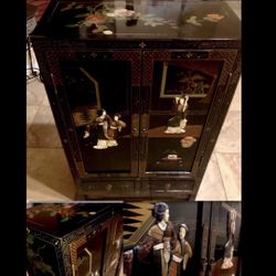 Oriental Chinese Antique black lacquer Hutch dresser w/colorful Carved hard stone, soap stone & hand painted designs Over 120 yrs oldSize is 40 inch h$400Houston, TX