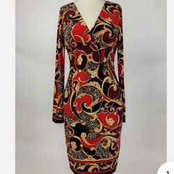 Cache Red Yellow, Maroon Swirl Cheetah, Sheath, Stretch V- Neck Dress Size: 6 $40Oak Ridge North, TX