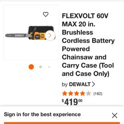 FLEXVOLT 60V MAX 16in. Brushless Cordless Battery Powered Chainsaw (Tool Only)$149Irving, TX