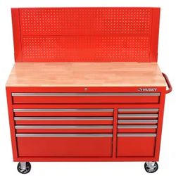 Husky 52 in. W 10-Drawer Gloss Red Mobile Workbench Cabinet with Solid Wood Top and Pegboard - R$425Garland, TX