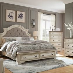 Realyn Chipped White Upholstered Storage Platform Bedroom Set with Footboard Bench
