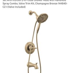 Delta Arvo 14 Series Brushed Gold Bathtub Shower Faucet Set with In2ition 2-in-1 Dual Shower Head with Handheld Spray Combo, Valve Trim Kit, Champagne$200Grand Prairie, TX